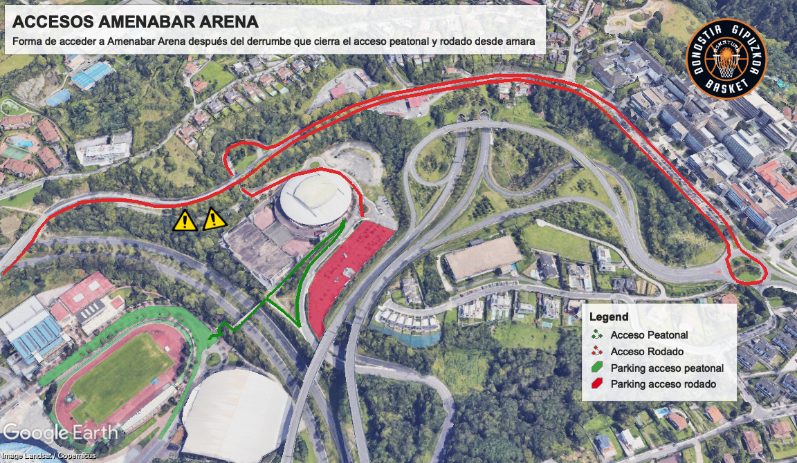 Debido a un derrumbamiento de tierra, el acceso habitual a Amenabar Arena desde Amara se encuentra cerrado tanto para peatones como para vehículos.