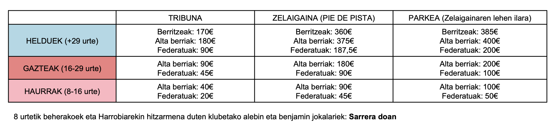 Denboraldian zehar, banakako sarrerek prezio hauek izango dituzte: