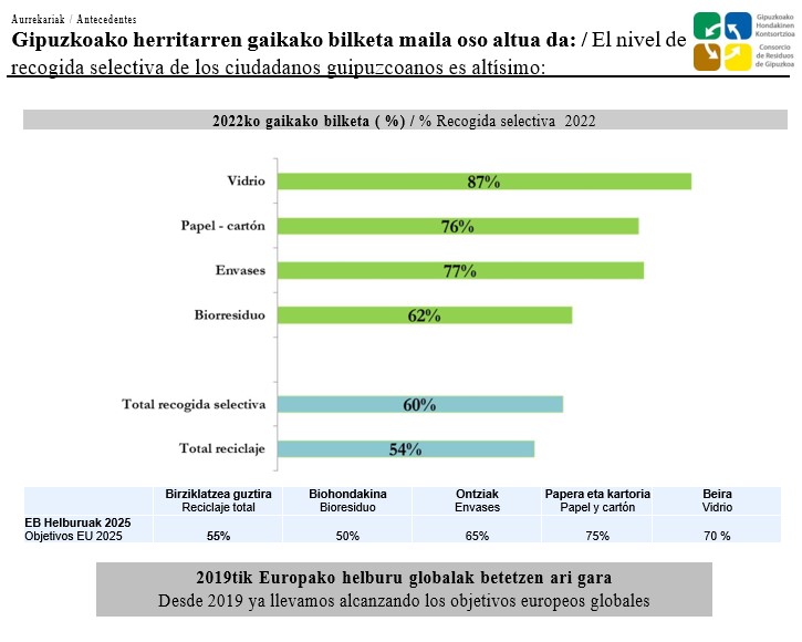 Gipuzkoa proporciona un 87% de recogida selectiva de vidrio, siendo el objetivo en la UE el 70%. En el caso del papel cartón, el porcentaje alcanzado es del 76%, mientras el listón europeo se sitúa en el 75%. La recogida selectiva de envases llega al 77% y en la UE la tasa está referenciada en el 65%. En el ámbito de los biorresiduos, Gipuzkoa se coloca en el 62% cuando la media europea roza el 50%.